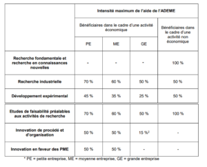 Les dépenses éligibles permettant de calculer l’aide sont constituées de la part des dépenses prévues considérées comme indispensables à la réalisation du projet, hors salaires de la Fonction Publique. L'ADEME participe financièrement pour 25 à 100 % des dépenses éligibles.