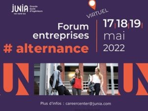 JUNIA propose son forum entreprises spécial ALTERNANCE les 17, 18 et 19 mai 2022, en virtuel. 3 jours de rencontres gratuites avec nos étudiants de Lille, Châteauroux, Bordeaux.