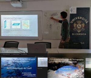 Ici lors d’une intervention sur mesure réalisée pour l’équipe de la plateforme du CNRS/Università di Corsica Stella Mare, en Corse, par le Dr. Jérôme Blanc sur le domaine spécifique de l’échographie, adapté à l’aquariologie.